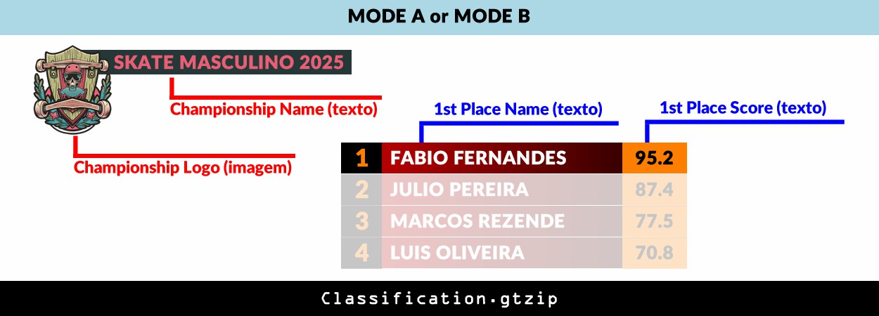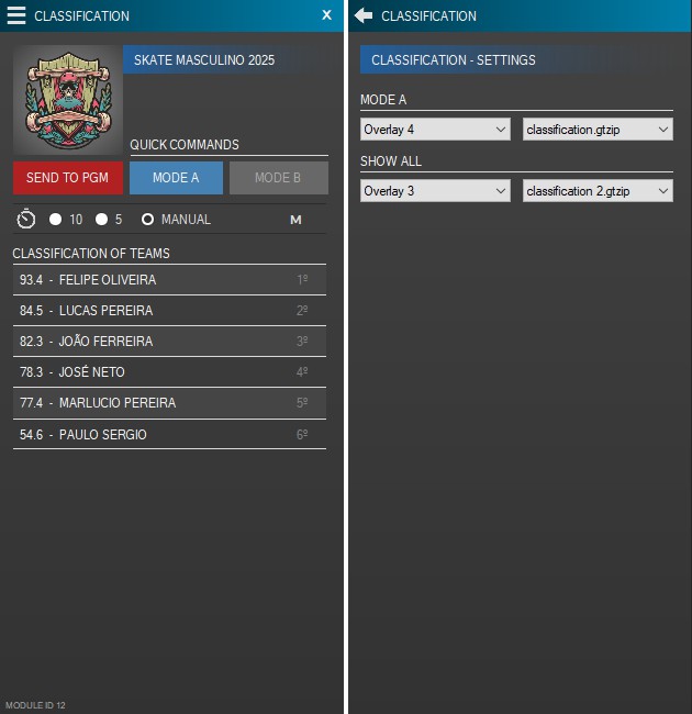O módulo conta com 2 modos de envio e 10 nomes de competidores com sua pontuação.