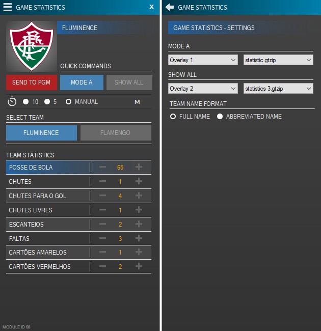 O módulo conta com 2 modos de envio, nome dos 2 times, logo dos 2 times e 8 estatísticas.