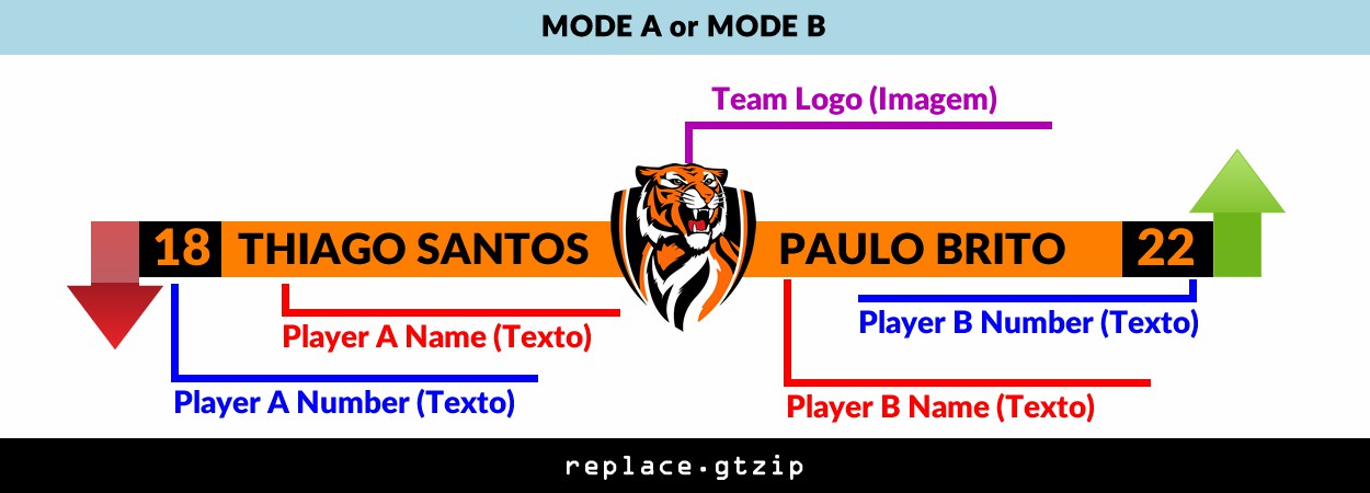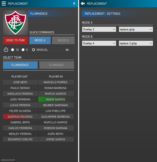 O módulo conta com 2 modos de envio, 11 nomes de jogadores titulares e 11 nomes de jogadores reserva.